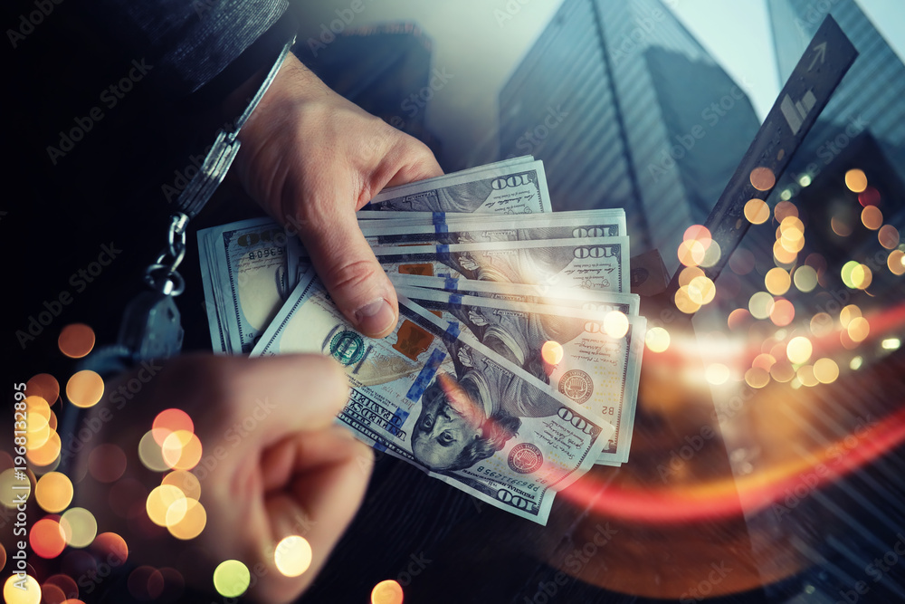 Double exposure city and hands of a man with handcuffs on a background of us dollars. Fraud, cyber crime concept. Arrest of an entrepreneur in the workplace. #1968132895