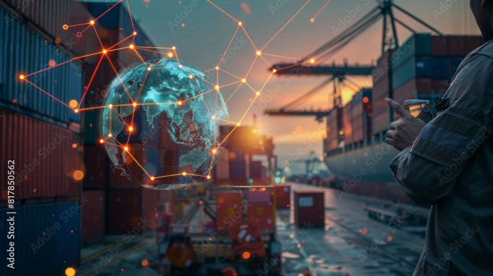 Double of engineer point to globe simulation with line connect to country with transportation shipment check for control loading containers box from Cargo freight ship for import and export #817850562