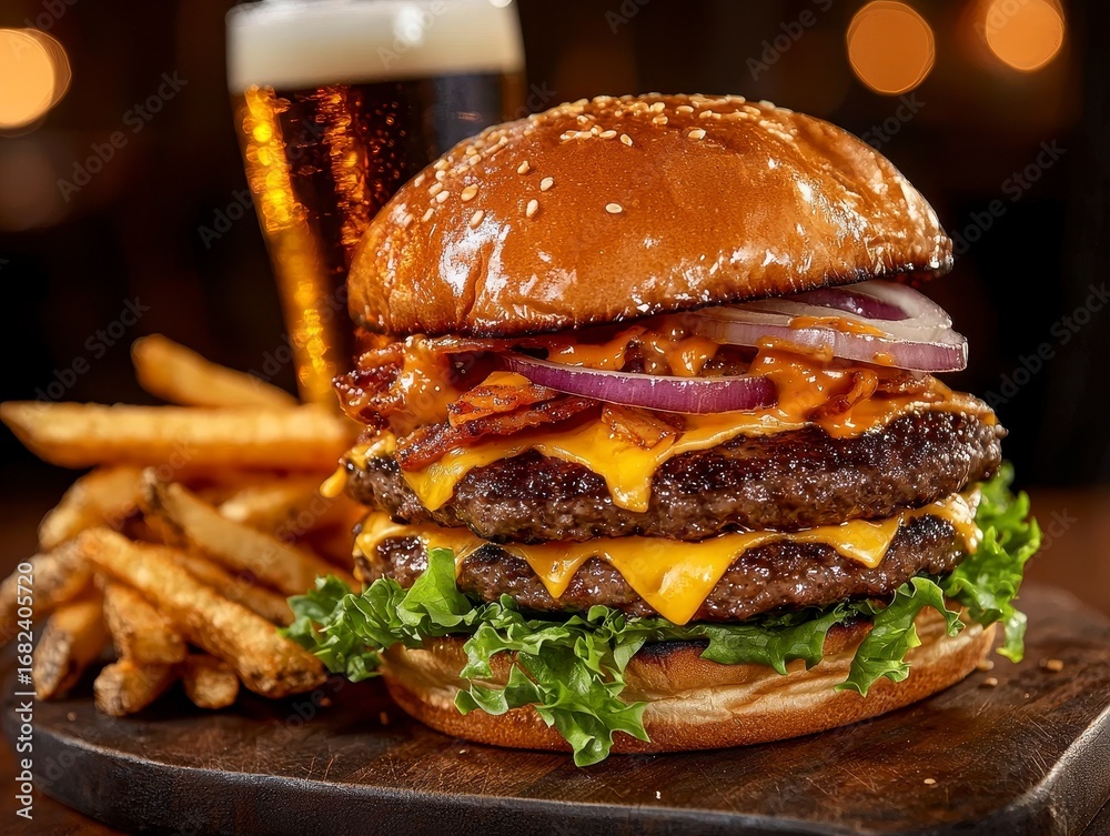 Double smash burger with cheese lettuce onion dressin. Two hefty ground beef patties cheeseburger with crisp romaine sliced allium creamy condiment a tasty diner classic culinary #1682405720