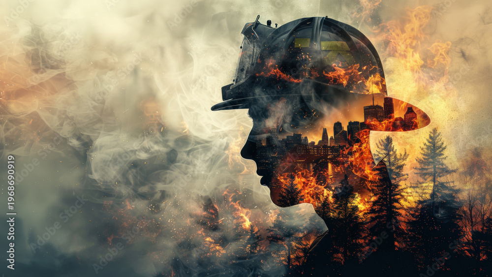 Dramatic double exposure portrait blending a firefighter helmet silhouette with blazing wildfire flames and burning forest trees in dark cinematic #1968690919