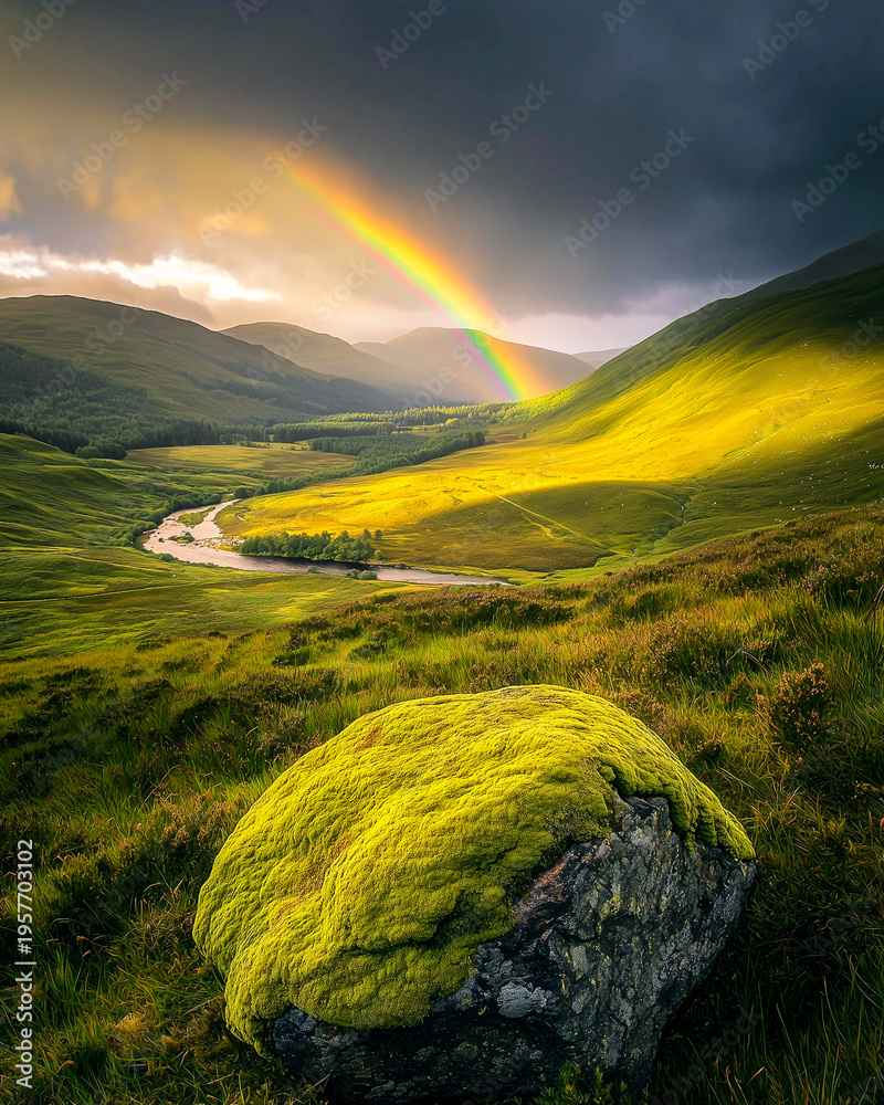 Dramatic landscape featuring a vibrant rainbow over a lush green valley, illuminated by golden sunlight, with a moss-covered rock in the foreground and winding river below #1957703102