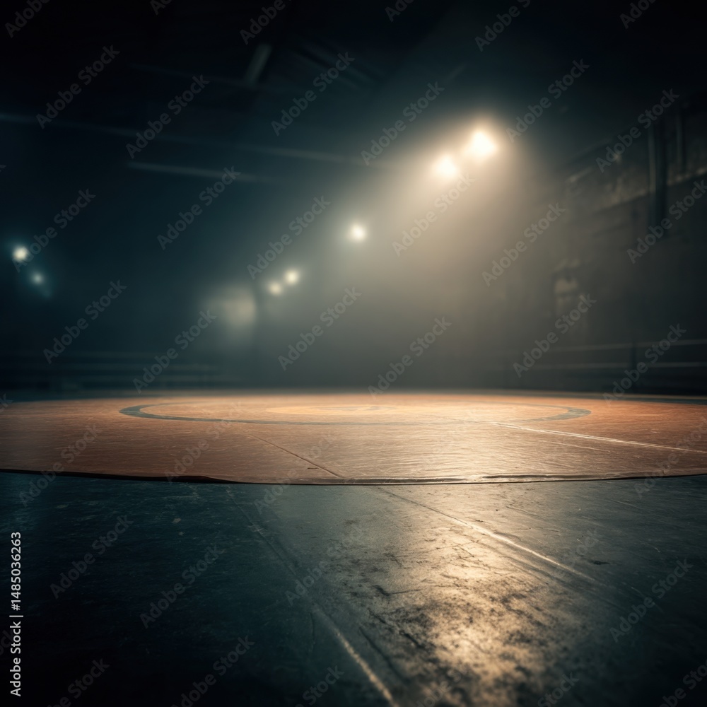 Dramatic low angle view of wrestling mat in dark gym under bright lights showing texture and detail for sports background #1485036263