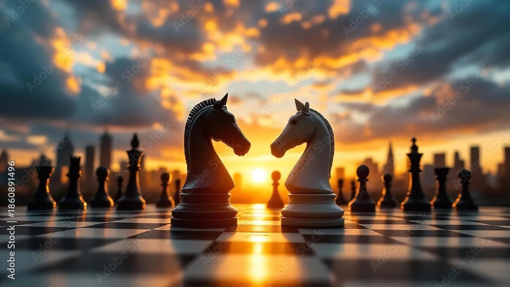 Dramatic showdown of chess knights facing each other on a chessboard against a city skyline at sunset, strategy #1860891496