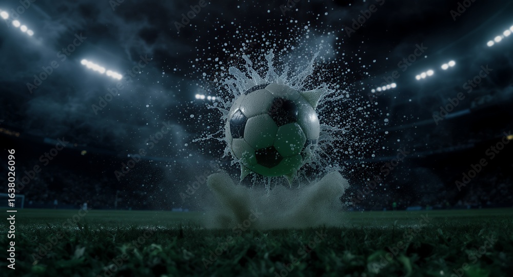 Dramatic Soccer Ball Splash Night Stadium Action Stock Photo #1638026096