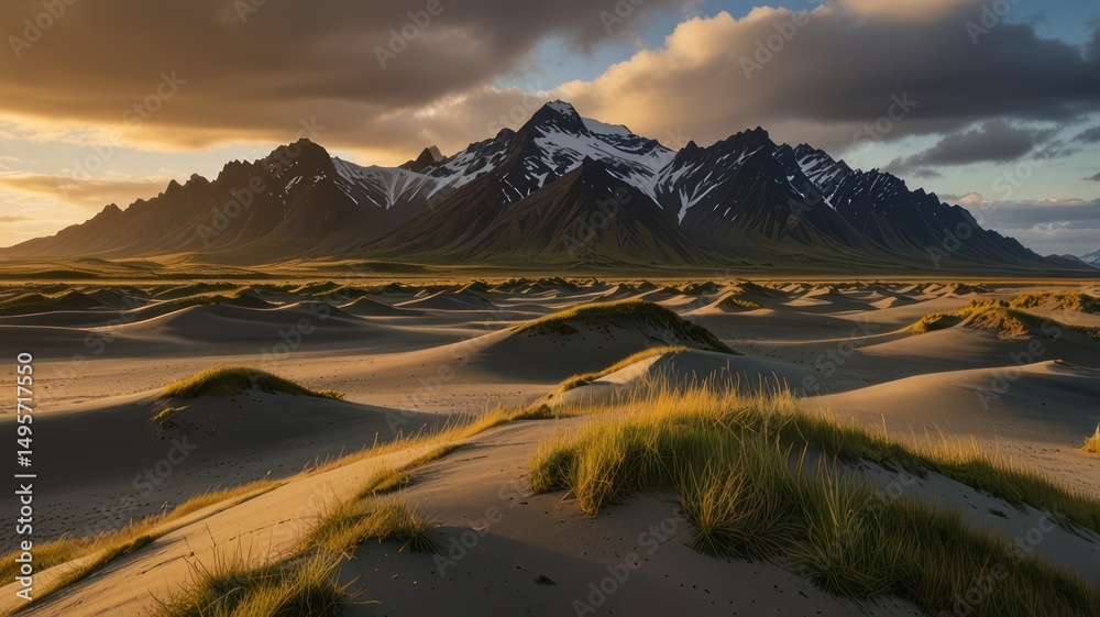 Dramatic sunset over a vast sandy landscape with mountains in the background #1495717550