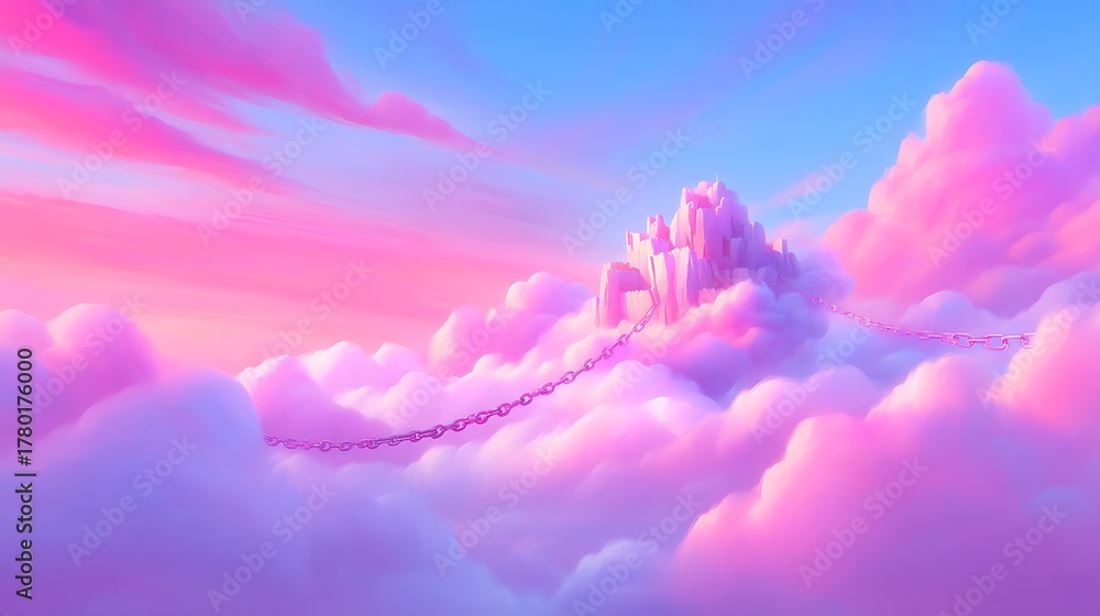 Dreamy pink cloudscape with pastel sky and fantasy castle chained in ethereal clouds #1780176000