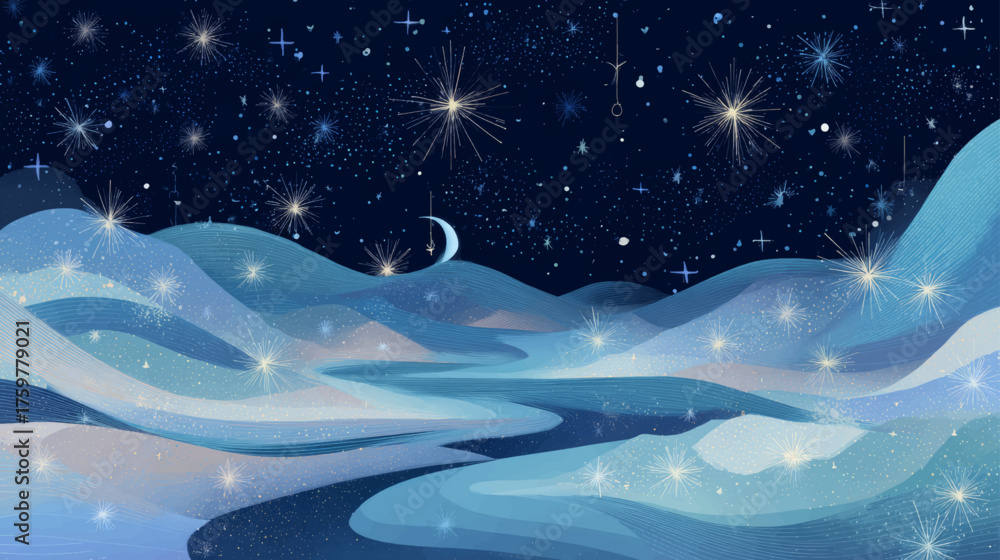 Dreamy starry winter landscape with crescent moon and glowing celestial hills, elegant abstract vector background for festive, seasonal, and Christmas design presentations. #1759779021