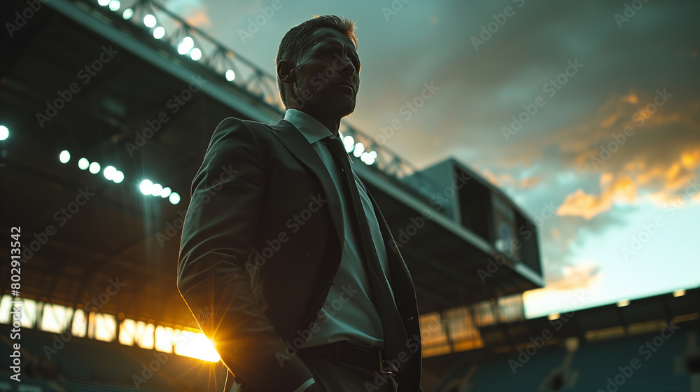 Dressed in stylish attire, a professional football manager stands with confidence at the stadium, his elegant posture and serious expression indicative of his focus on leading the team to victory. #802913542