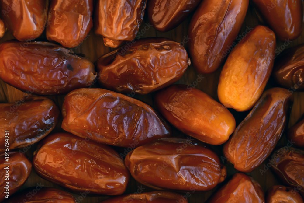 Dried medjoul jumbo dates.Dried dates fruits on the wooden surface. Arabic food for the ramadan. Food and health background. Delicious fresh organic dates. #1915734951