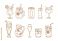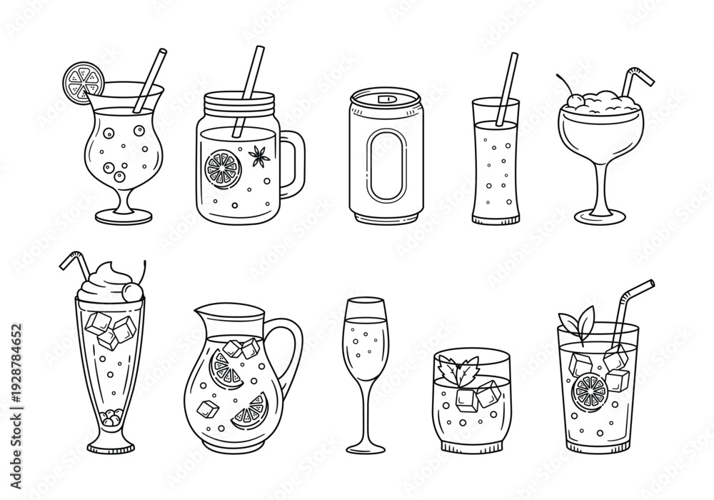 Drink and beverage doodle. Cocktail, mocktail and juice, soda and beer, smoothie and champagne, sketch wine and martini, mojito and lemonade, iced tea. Hand drawn outline vector isolated set #1928784652