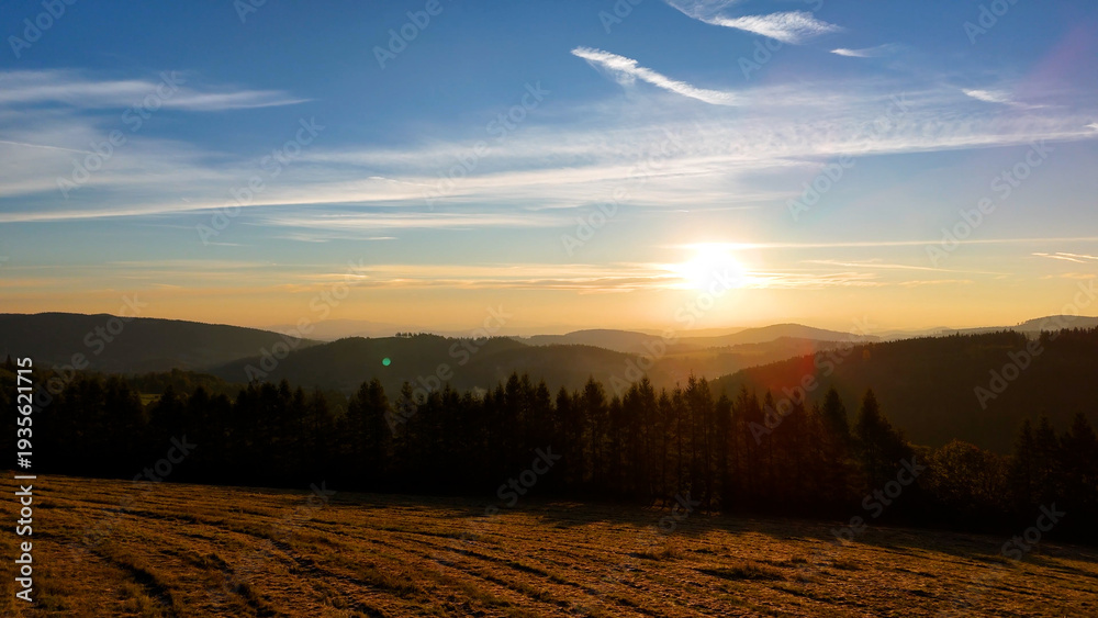 Drone flight over sunrise, mountains, forest, USA, America #1935621715