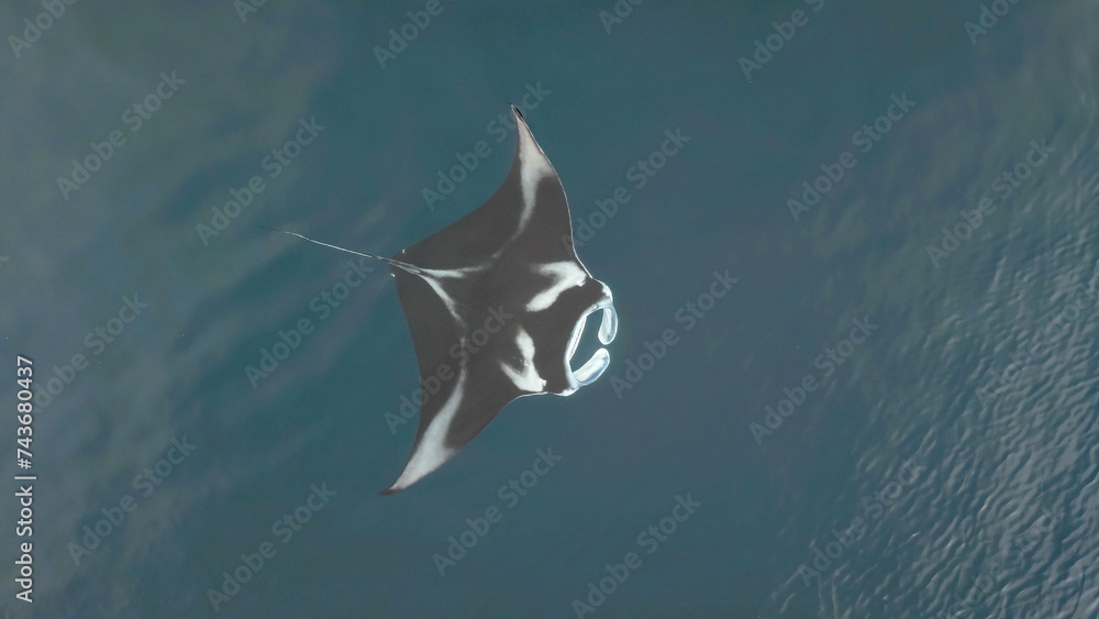 Drone Photo of a Manta Ray Swimming in the Ocean #743680437