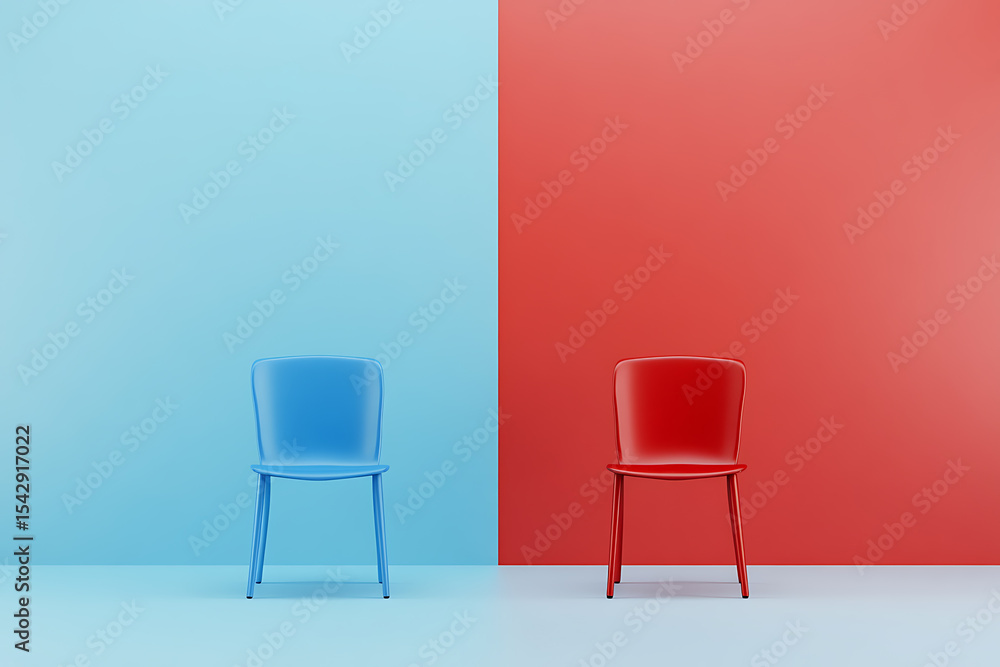 Dual Chairs: A minimalist studio shot featuring a blue chair against a blue backdrop and a red chair against a red backdrop, symbolizing contrast and balance. #1542917022