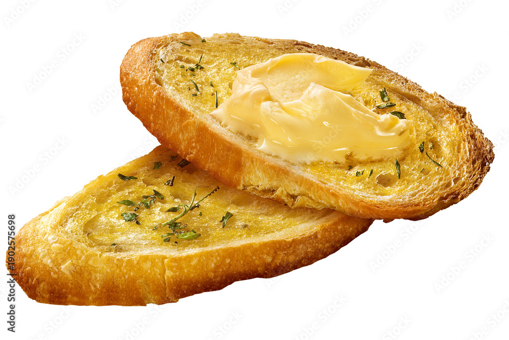 Duas fatias de pão baguete torradas com manteiga derretida e ervas isoladas no fundo transparente #1902575698