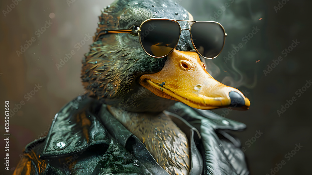 Duck wearing a leather jacket and sunglasses #835061658