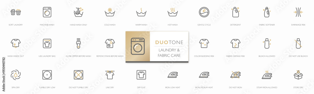Duotone laundry and fabric care icon set. Minimalist line style, editable stroke for washing, drying, ironing, and fabric care instruction for apps, packaging, manual and UI. Vector Illustration #1930440782