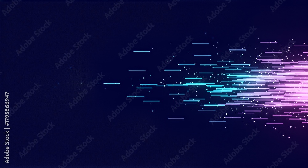 Dynamic abstract digital flow of glowing neon light streaks and particles across a dark cosmic background, representing speed, data, and futuristic connection #1795866947