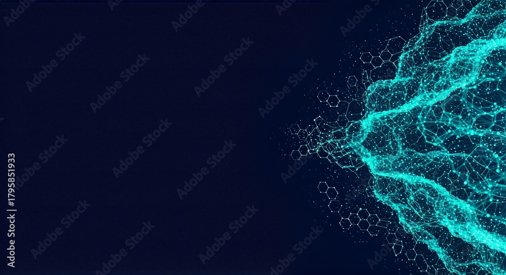 Dynamic abstract network of glowing cyan lines and dots forming intricate geometric patterns against a deep dark blue background, representing data connectivity and digital transformation. #1795851933
