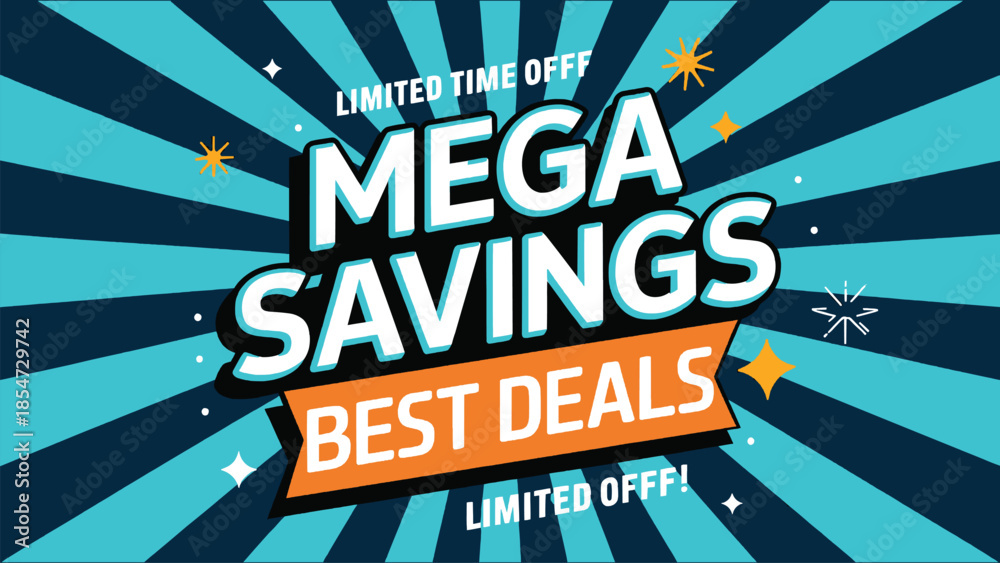 Dynamic announcement banner advertising mega savings and best deals for a limited time offer with bright retro style graphics #1854729742