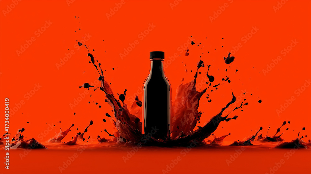 Dynamic Dark Liquid Splash Around Bottle on Orange #1734000419