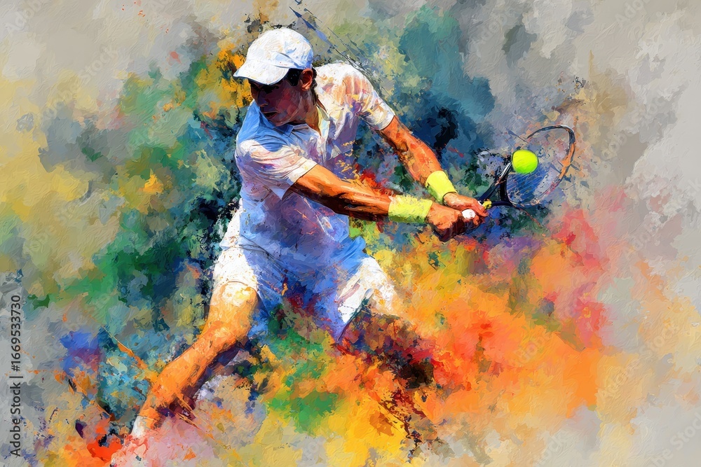 Dynamic depiction of a tennis player striking a powerful backhand in a vibrant, abstract style with a colorful background #1669533730