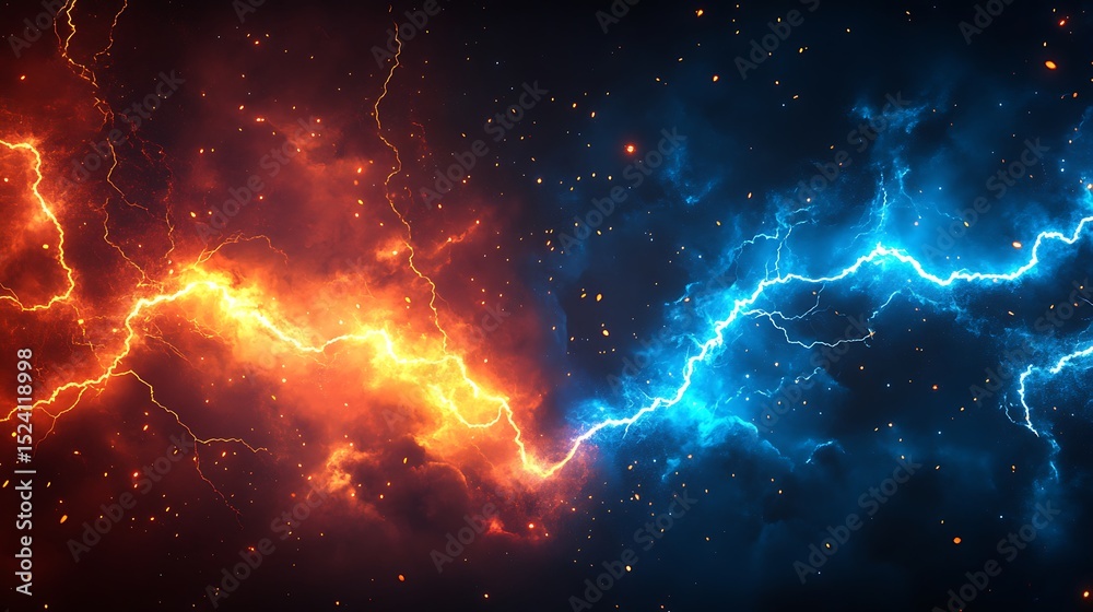 Dynamic energy background with fire and ice lightning bolt effect amidst dark clouds creating intense atmosphere #1524118998