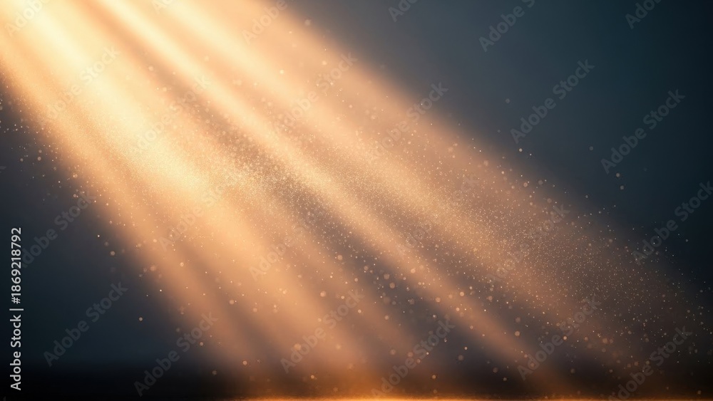 Dynamic golden light rays piercing through a dark void with shimmering dust particles #1869218792