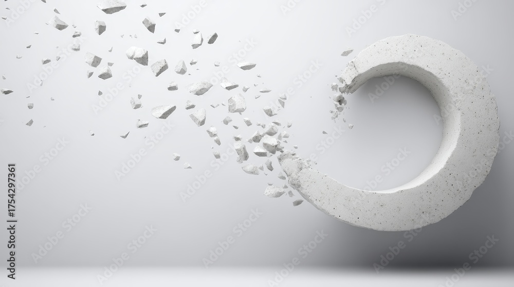 Dynamic grayscale abstract shot of swirling shattered material forming a spiral with textured fragments and open space, capturing movement and energy in a modern geometric design #1754297361