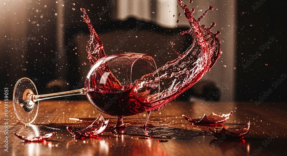 Dynamic image capturing a splash of red wine spilling from a glass onto a wooden surface creating motion and excitement in a sophisticated setting perfect for wine or beverage advertising #1978159051