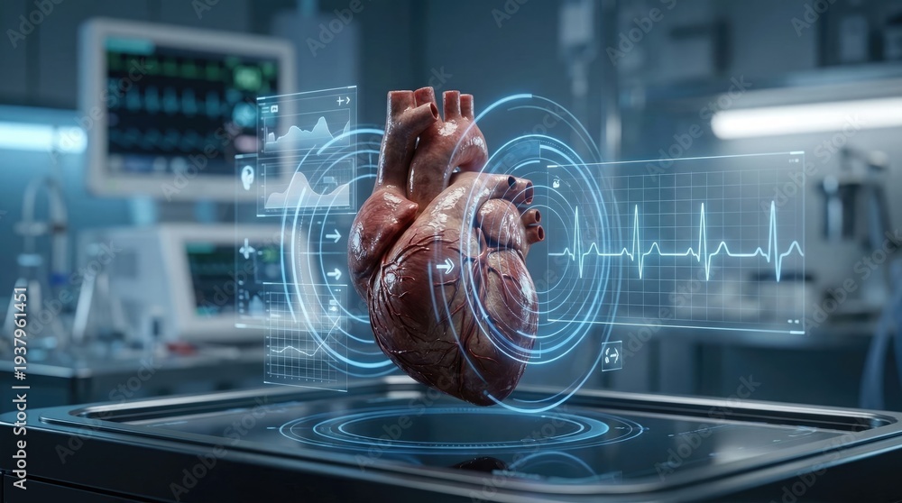 Dynamic medical illustration of a human heart in a high-tech laboratory environment with advanced monitoring systems #1937961451