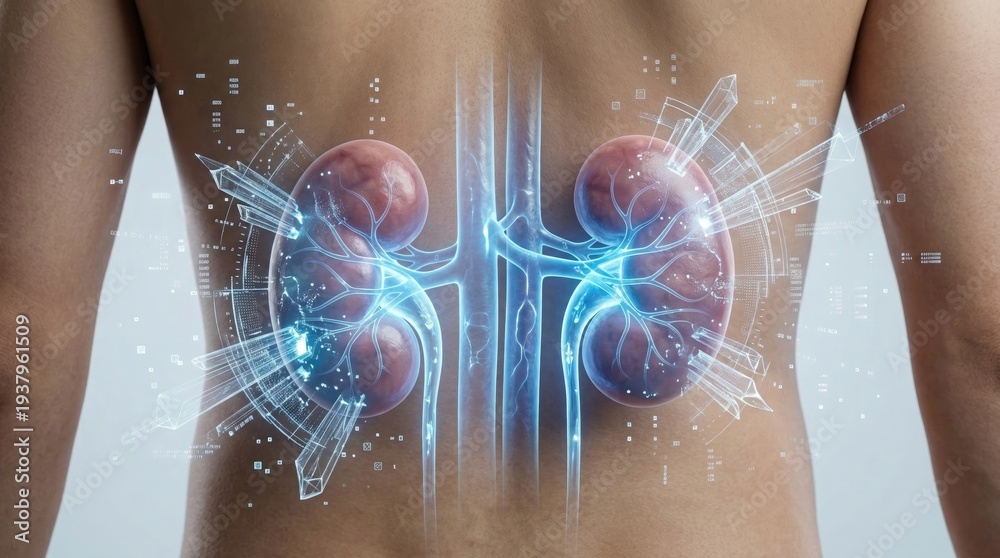 Dynamic medical illustration of kidney function human anatomy digital art clinical environment close-up view health concept #1937961509