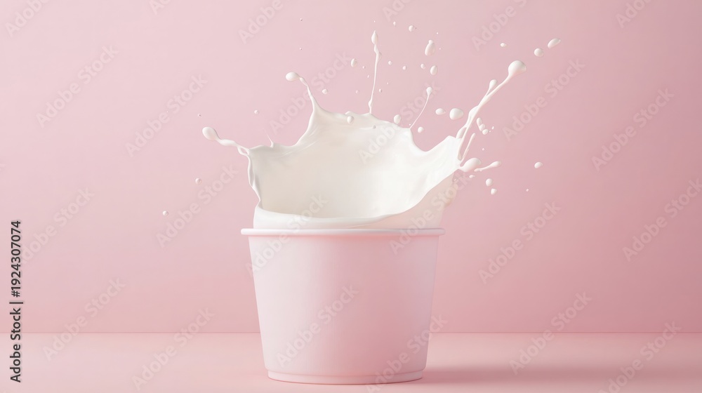 Dynamic milk splash swirling around blank yogurt container with simulated packaging design, isolated against solid pastel background #1924307074