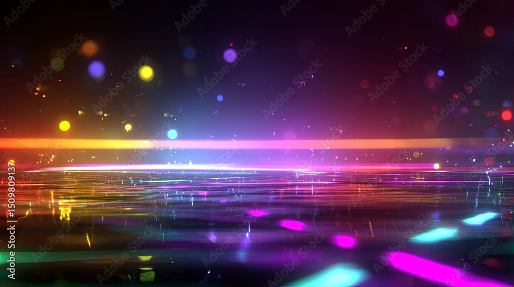 Dynamic neon-lit dance floor scene with abstract light trails, vibrant gradients, atmospheric club lighting, and glowing particles in blurred background #1509809137