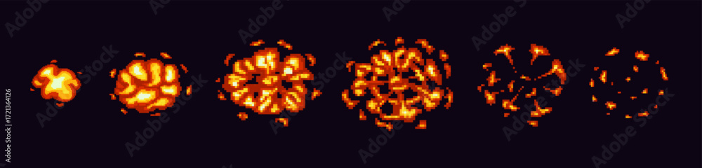 Dynamic pixel art explosion featuring bright orange flames and sparks, perfect for digital design. #1721364126
