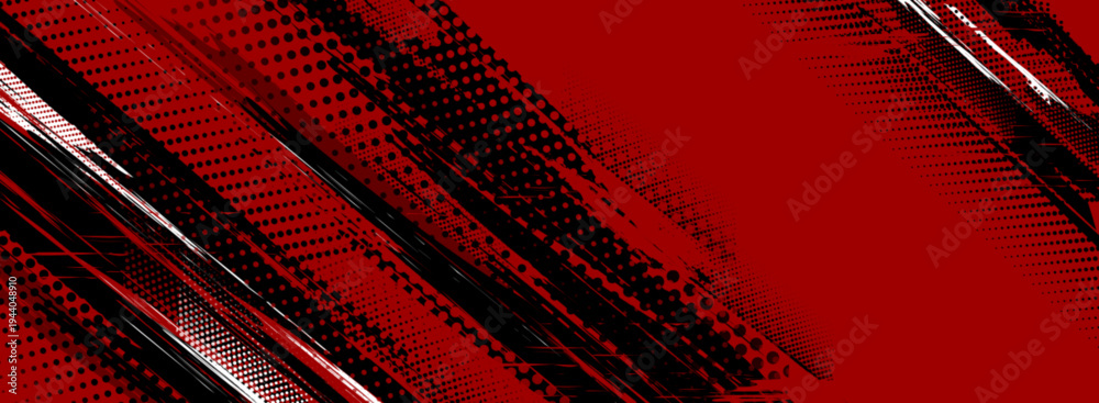 Dynamic red sport background with black halftone pattern, white accents and abstract speed lines, vector banner. Energetic motion effect with grunge texture for athletic events design, presentations. #1944048910