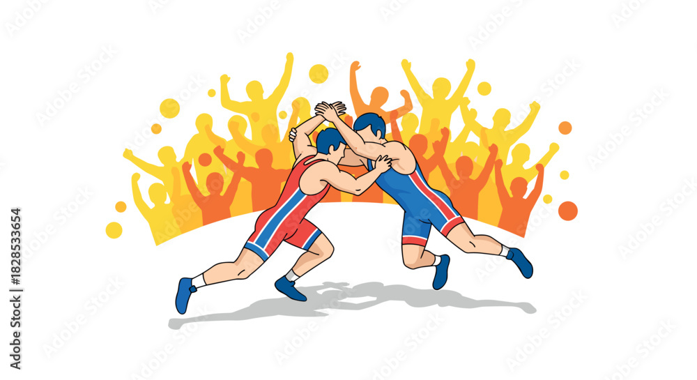 Dynamic wrestling match with vibrant crowd background in flat style #1828533654