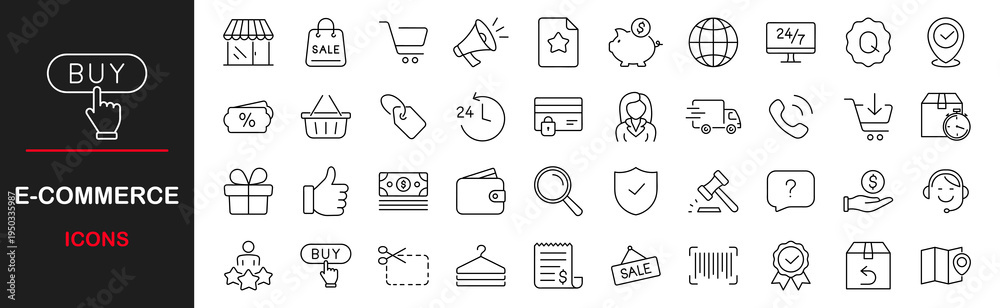 E -Commerce web icons set. E - Commerce - simple thin line icons collection. Containing shopping cart, support, credit card, discount, search, market, shop, delivery and more. Simple web icons set #1950335987