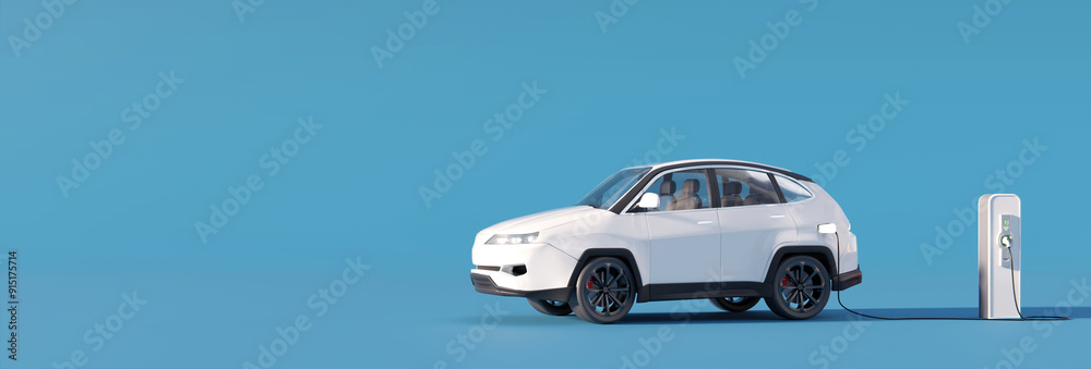 E-mobility, electric car charging battery on blue background. 3d rendering #915175714