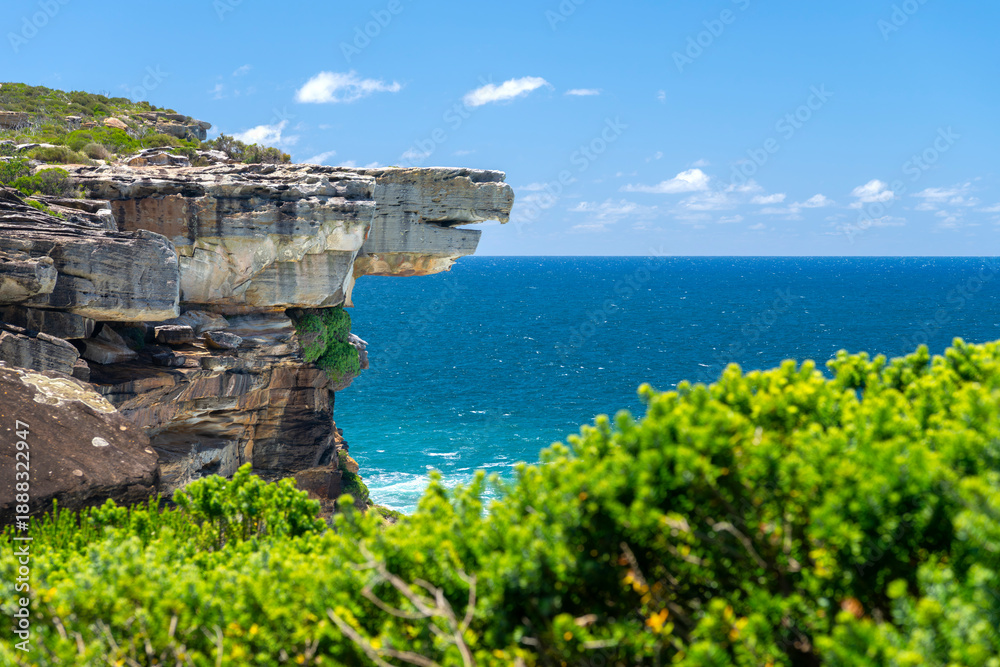 Eagle Rock sandstone cliff overlooking the ocean along the coastal trail in Royal National Park, Sydney, Australia, featuring dramatic headland views and blue water. #1888322947