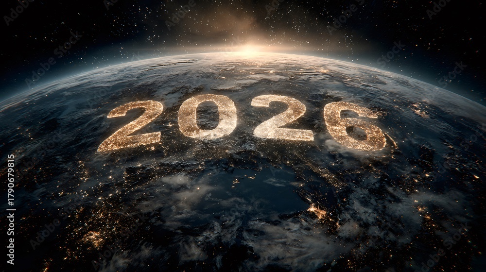 Earth showing year 2026 city lights at sunrise #1790679815