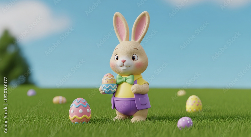 Easter Bunny with Colorful Painted Eggs on Green GrassCute 3D Easter Rabbit Character with Decorative EggsSpring Easter Celebration with Bunny and Easter Eggs #1920180177