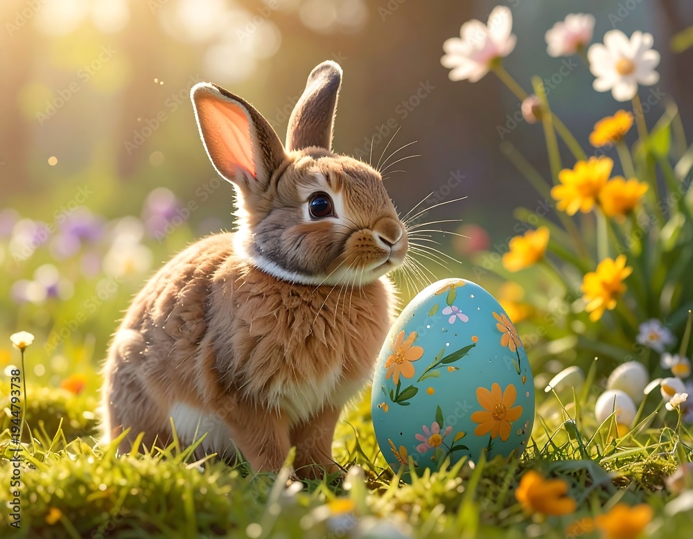 Easter Bunny with Egg in a Field of Flowers - Springtime Celebration. #1944793738