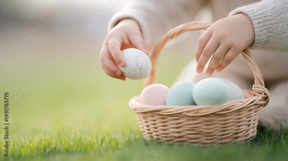 Easter egg hunt, child hands place pastel eggs into wicker basket on grass. Spring celebration, family tradition, agriculture concept, seasonal retail marketing #1931785775