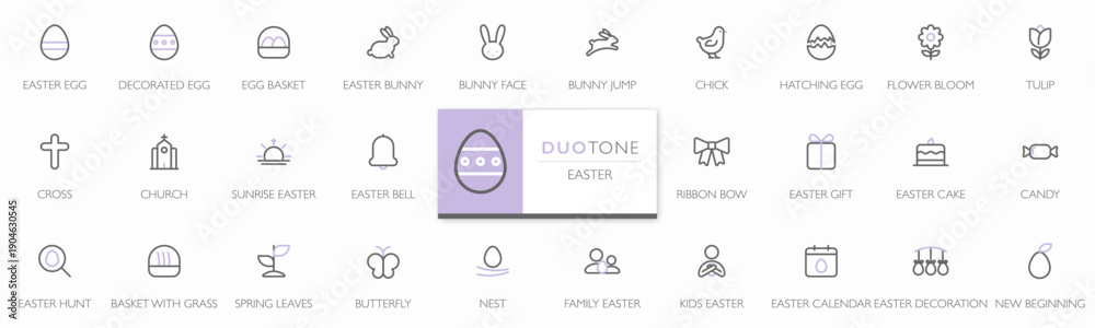 Easter icon set in duotone minimalist line style. Modern flat icons with editable stroke, clean geometric shapes and soft pastel accent for spring, holiday, celebration, family, kids, UI and app #1904630545