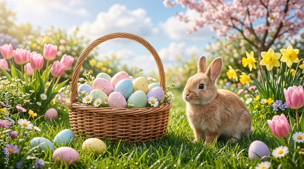 Easter's Charm: A fluffy bunny alongside an Easter basket brimming with colorful eggs amidst a vibrant spring meadow, heralding the spirit of the season. #1967976408