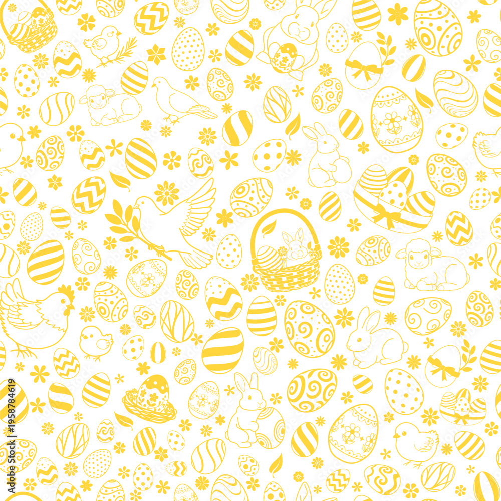 Easter seamless pattern with eggs, bunnies, lambs, chicks, flowers, and baskets in yellow on white background for holiday designs. #1958784619