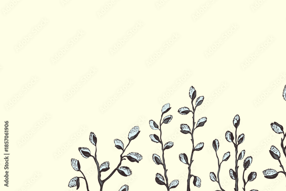Easter spring frame, border with sprigs of willow. Template hand drawn design for banner, poster, card, paper. Holiday print. Branch with pussy willow buds. Vector illustration background. #1857061906