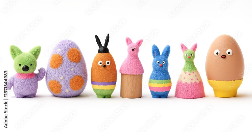 Easter Toy Figurine Row Felted Bunny Egg Characters Cat Spring Colorful Isolated Horizontal White #1971344983
