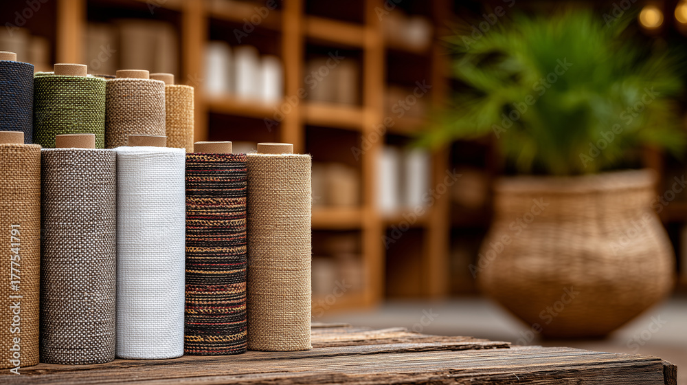 Eco-friendly fabric studio display with flax linen and cotton rolls, woven burlap and coarse canvas in textured patterns, highlighting natural craftsmanship and boho living aesthet #1777541791