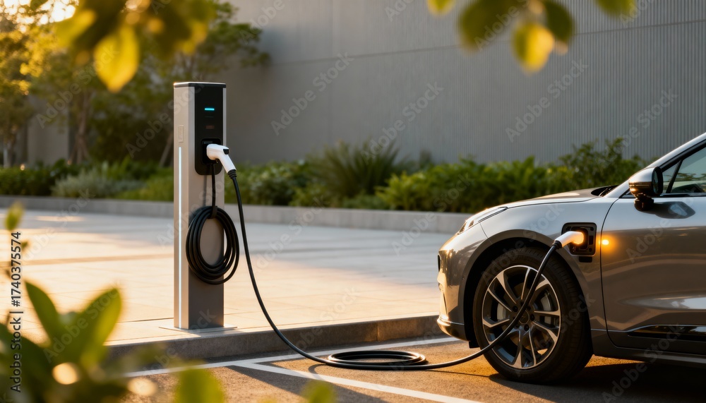 Eco-friendly transportation, electric car being charged with power plug, modern sustainable mobility, photo #1740375574